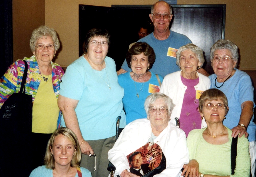 STANDING: VERDA CAMPBELL, SHERYL BUSS, LORAINE ALBERGA, CHARLES LETTERMAN, LILIA ALBERGA AND BETTY STENGER. DOWN FRONT IS MELISSA RICKETTS, EDITH BUSS AND SANDI WICHERN. DON'T FORGET TO LOOK CLOSELY AT EDITH'S BAG. A PURSE MADE TO LOOK LIKE A LAWRENCE WELK LP ALBUM. ONE SIDE IS THE FRONT AND THE OTHER SIDE IS THE BACK OF THE ALBUM. SHE'S PROUD OF THAT BAG AND THE WELKNOTES IS PROUD OF HER!! |