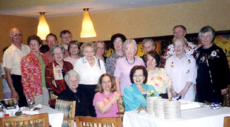 THOSE WHO JOINED JUDY FOR HER BIRTHDAY PARTY GATHER ROUND THE THE GUEST OF HONOR. FROM LEFT TO RIGHT CHARLES LETTERMAN - BETSY GRIFFITH - TRACY GOODWIN - PAT CLARK - SCOTT ANDERSON - LINDA CIOTTI - LEE STEWART - INESE WALLACE - MARGARET HERON - BETTY STENGER - MA - ROSANNE GALLETTA - TRUDY LETTERMAN - KEN LETTERMAN - EVELYN FERSTL AND IN FRONT, AUDREY GOTTSHALL AND VICKI ANDERSON WITH JUDY |