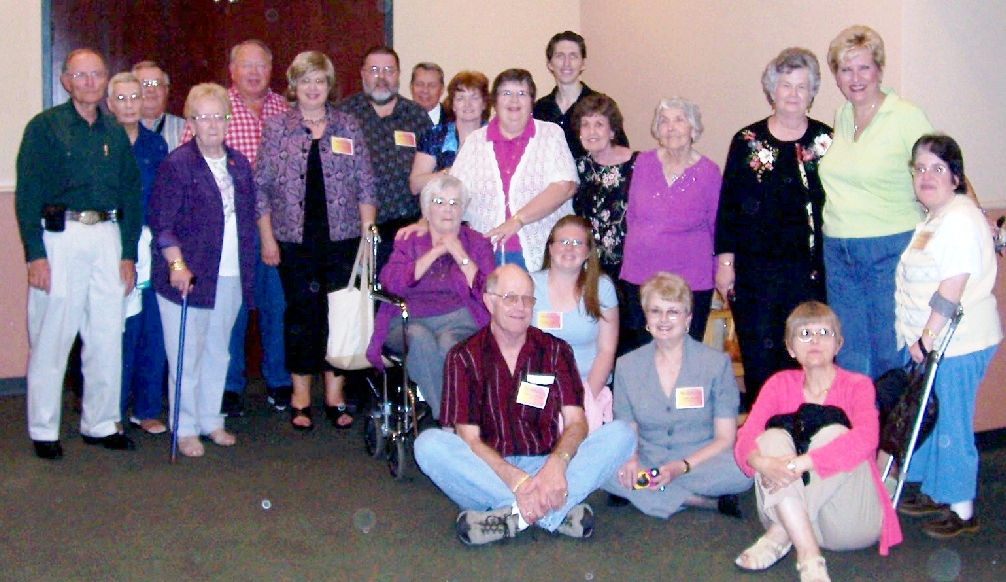 KEN LETTERMAN, CAROLIE AND LARRY FELLER, TRUDY LETTERMAN, GENE MAXWELL, JEANNE AND DICK SHEFVELAND, HARRY ABBOTT, TERRY O'DONNELL, SHERYL BUSS, TIM PADILLA, LORAINE AGREBLA, LILIA AGREBLA, EVELYN FERSTL, AVA BARBER AND ROSANNE GALLETTA WITH EDITH BUSS, CHARLES LETTERMAN, COURTNEY JOHNSTON, DIANE MAXWELL AND SANDI WICHERN SITTING DOWN IN FRONT. |